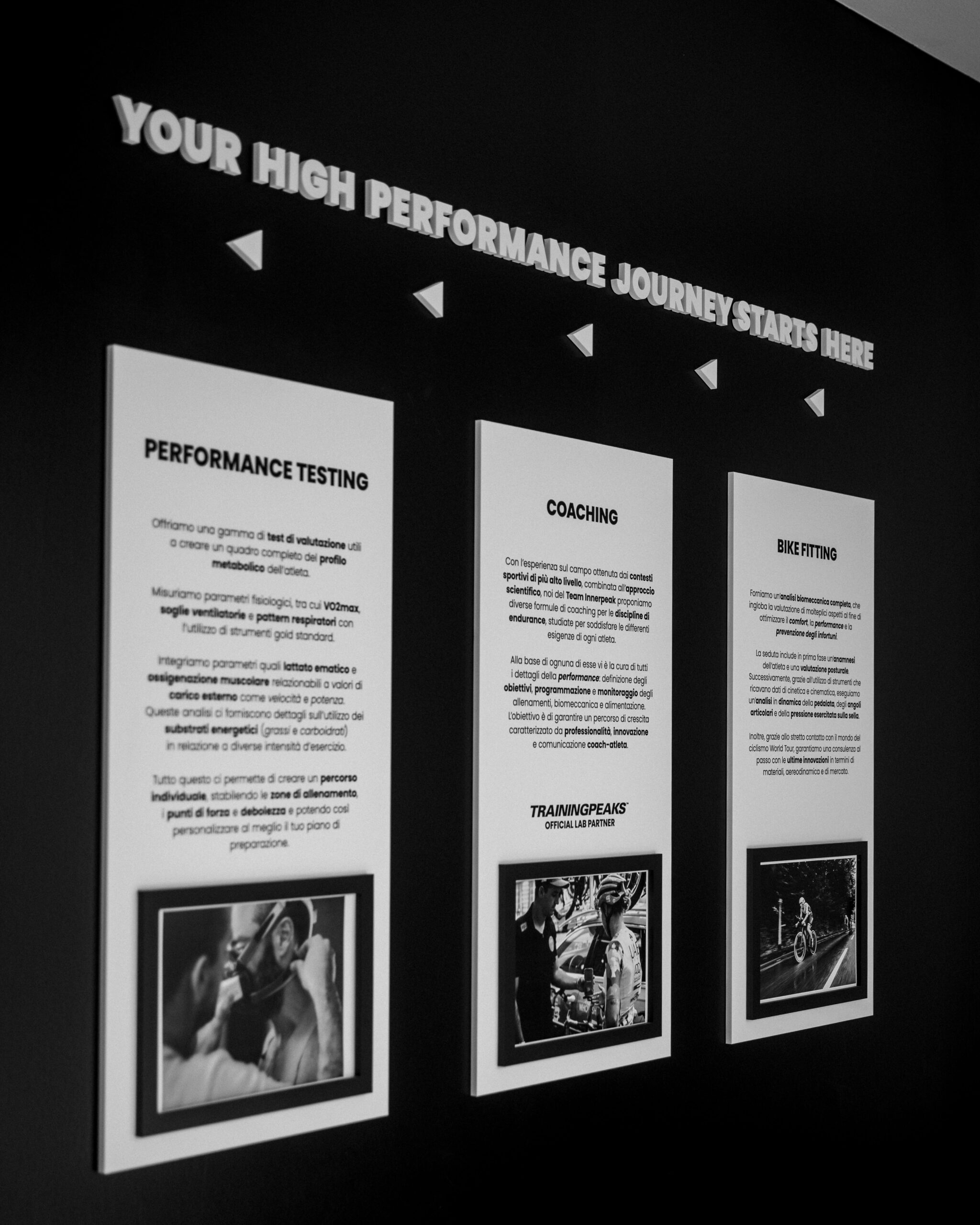 L’esigenza di INNERPEAK era di aprire e organizzare una sede fisica, come punto di riferimento per atleti e amatori degli sport di endurance. In più, bisognava creare un’identità coerente, per: trasmettere il valore scientifico dei servizi offerti, in un settore in forte evoluzione;